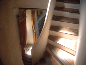 Exposed stonework, large wooden beams, a classic winding staircase from cellar to roof terrace,