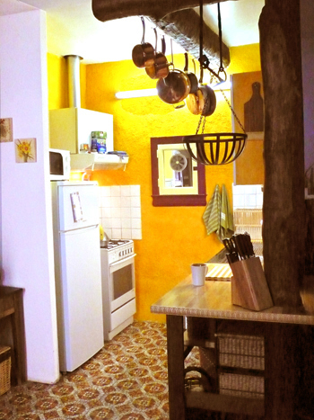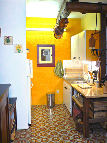 Recent kitchen renovation adds more workspace for the cook. Quality copper pots and pans are traditionally hung and a newly-built wooden table includes a variety of cooking utensils for your needs. Utilities include gas stove/oven with electric grill, microwave and large refrigerator/freezer. You will also find a wok, as well as tea kettle, coffee maker, french press, toaster, etc...