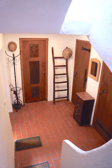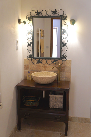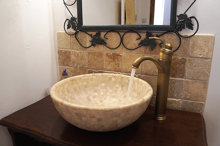 To keep with the ancient charm, travertine tiles (via Italy) were laid throughout the room & complimented by a handmade sink. Old wooden hutch adds to the flavor, along with wrought iron mirror and stand. Shower and faucet are quality bronze. In the cooler months, this room has heated flooring and a towel warming rack to keep you toasty!