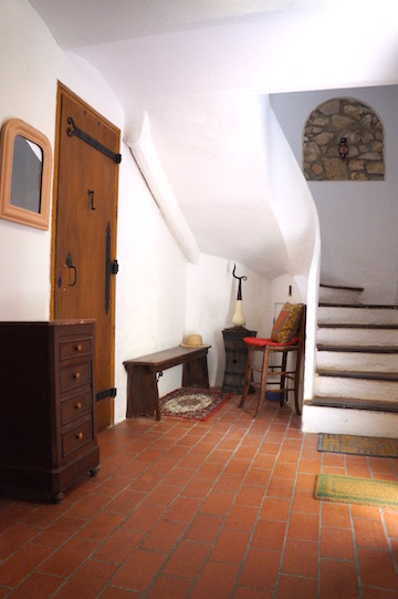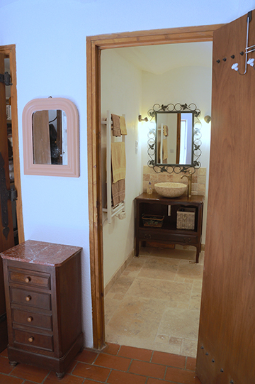 To keep with the ancient charm, travertine tiles (via Italy) were laid throughout the room & complimented by a handmade sink. Old wooden hutch adds to the flavor, along with wrought iron mirror and stand. Shower and faucet are quality bronze. In the cooler months, this room has heated flooring and a towel warming rack to keep you toasty!